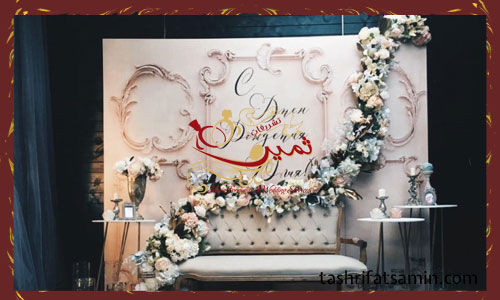 برای کفپوش مراسم چمن مصنوعی گزینه ی مناسبی می باشد و یک قاب چوبی ساده برای پشت جایگاه انتخاب کنید. می توانید روی این قاب را با پارچه حریر سفید تزیین کنید و بسته به رنگی که به عنوان تم مراسم انتخاب می کنید یک رنگ حریر دیگر نیز بر روی قاب قرار دهید به عنوان مثال چنانچه لباس عروس قرمز، صورتی، یاسی و... باشد می توانید حریر پشت جایگاه را با لباس عروس ست کنید.